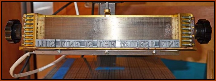 This is a picture of the "jaws" - typeholder of one of my machines. This is the MAX width that it can open up to which is around 9 inches. Below is the type-print that was in the machine during photograph.