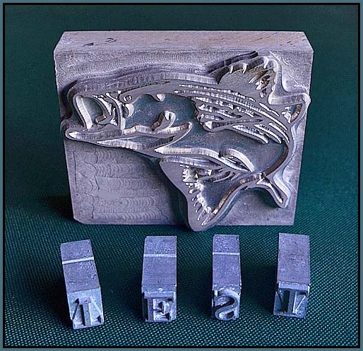This is a picture of a magnesium die of a fish image that I had made which I can stamp and some TNR characters. The first three "T E S" are they way they get set in the "jaws" The last "T" is just flipped over for reference here.